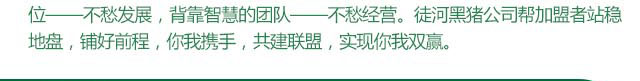 先思、先悟、先行、先入、先得、先贏,先人一步創(chuàng)品牌,先入為主占市場。任何產(chǎn)業(yè)加盟成功的關(guān)鍵都是將企業(yè)和加盟商聯(lián)系在一起,“你中有我,我中有你”,實現(xiàn)加盟投資者與企業(yè)雙贏。背靠品牌的創(chuàng)業(yè)--不愁人氣,背靠大樹的店鋪--不怕競爭,備考健康的定位--不愁發(fā)展,背靠智慧的團隊--不愁經(jīng)營。徒河黑豬公司幫加盟者站穩(wěn)地盤,鋪好前程,你我聯(lián)手,共建聯(lián)盟,實現(xiàn)你我雙贏。