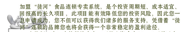 ,憑借著“徒河”連鎖的品牌您也將會獲得一個非常穩(wěn)定的盈利途徑。